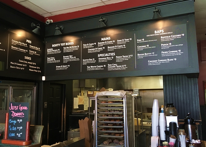 - the British-oriented Pub and Chip Shop in the South Side Flats (boxty tot plates with everything from Bangers to Fried Chicken and Sausage Gravy, fish and chips, and donuts made fresh daily….)