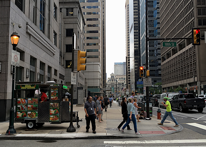 | City Center Philadelphia around lunch time, with a Halal Pakistani-owned Halal food carts on the left |