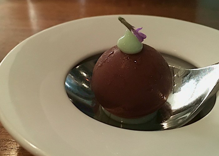 Similarly, the closing desserts, Blueberries many ways with Greek yogurt ice cream (cool and clean, a perfect palate cleanser) and the coup de grace one-spoonful chocolate bite with liquid interior infused with fresh mint, proved a great way to close out the night.
