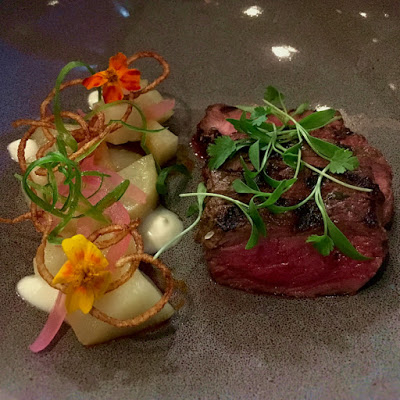 By a sliver, our favorite dish of this night arrived next: Buttery Prime Strip marinated with a chimichurri sauce provided a punchy one-two combo with the simple sounding but multi-textured Potatoes with Harissa, edible flowers and other culinary accouterments.