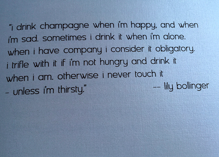 | Our Chef\’s Table Tasting Menu meal at Veritas started appropriately enough with a nicely dry glass of bubbly (Ms. Bollinger would approve) |