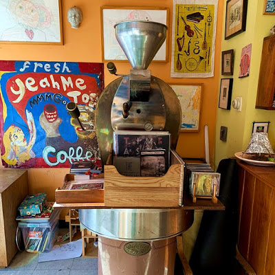 What you do get is artwork from local artists and Karcic himself dotting the walls, along with a few stray empty jute bags that once held raw coffee beans ready for roasting. On this day, a half-filled box of vinyl albums and CD’s stood guard over the Sweet Maria’s roaster.