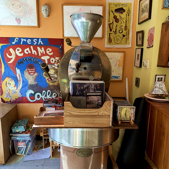 What you do get is artwork from local artists and Karcic himself dotting the walls, along with a few stray empty jute bags that once held raw coffee beans ready for roasting. On this day, a half-filled box of vinyl albums and CD’s stood guard over the Sweet Maria’s roaster.