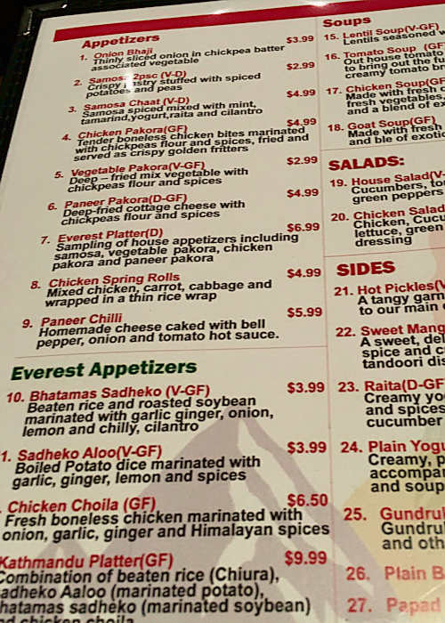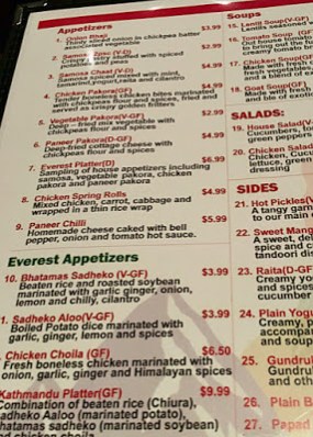 Or if that’s too flighty or weighty a subject to ponder, one can simply bring a willingness to exercise their culinary curiosity. A good and delicious place to start might just be Everest’s relatively inexpensive buffet lunch: just be sure to bring your wallet or purse, and a big appetite.