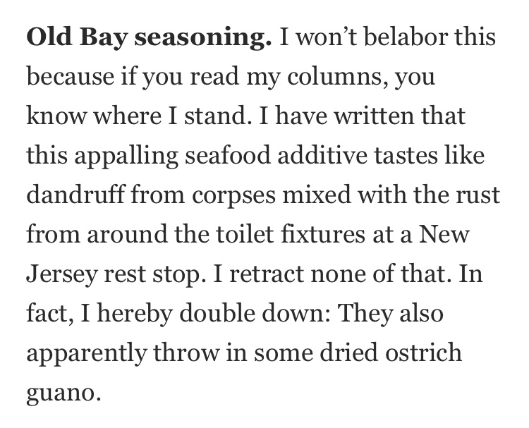 But expressing that dislike in a funny way is hard to do. Hell, good humor in general is a difficult task. I peppered this analysis of Weingarten’s column with my own bits of humor, but I admit this blogpost’s total humor content is probably the equivalent of the amount of Everything Seasoning grains still embedded on the average bagel in the grocery store bargain bin.