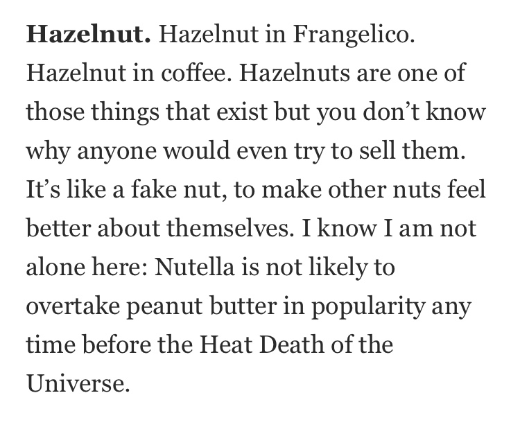 Hazelnut: I admit, the easy target to me would be something like pumpkin and pumpkin spice (maybe Weingarten loves those things?) so I’ll give him a few points here. However, maybe he misses the irony of touting the spread of the ultimate fake-nut (peanut, which is a legume) over the “fake-nut”-containing Nutella spread. Additionally, his claim that peanut butter will never be usurped by Nutella only applies to the United States – worldwide, Nutella outpaces all peanut butter brands in sales.