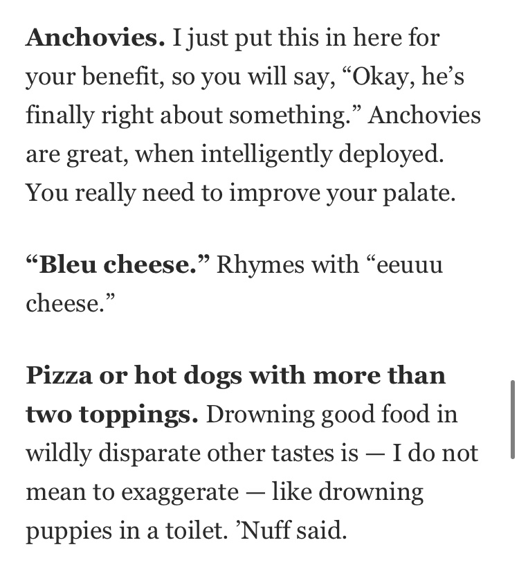 Anchovies, “Bleu Cheese”, and Pizza/Hot Dogs with more than two toppings: Weingarten’s anchovy entry is a curveball, since most people are of the dislike anchovy crowd (including yours truly.) It’s a clever maneuver, so I gave out a mild chuckle here.