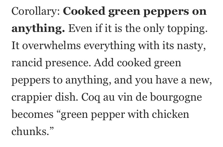 On the other hand, I do prefer yellow and red peppers over their green counterparts, so I’ll toss out a mild thumbs-up with that one. But I do wonder if there are really any supremely fanatical green pepper fans/serial green pepper haters that would be set aflame by his take.