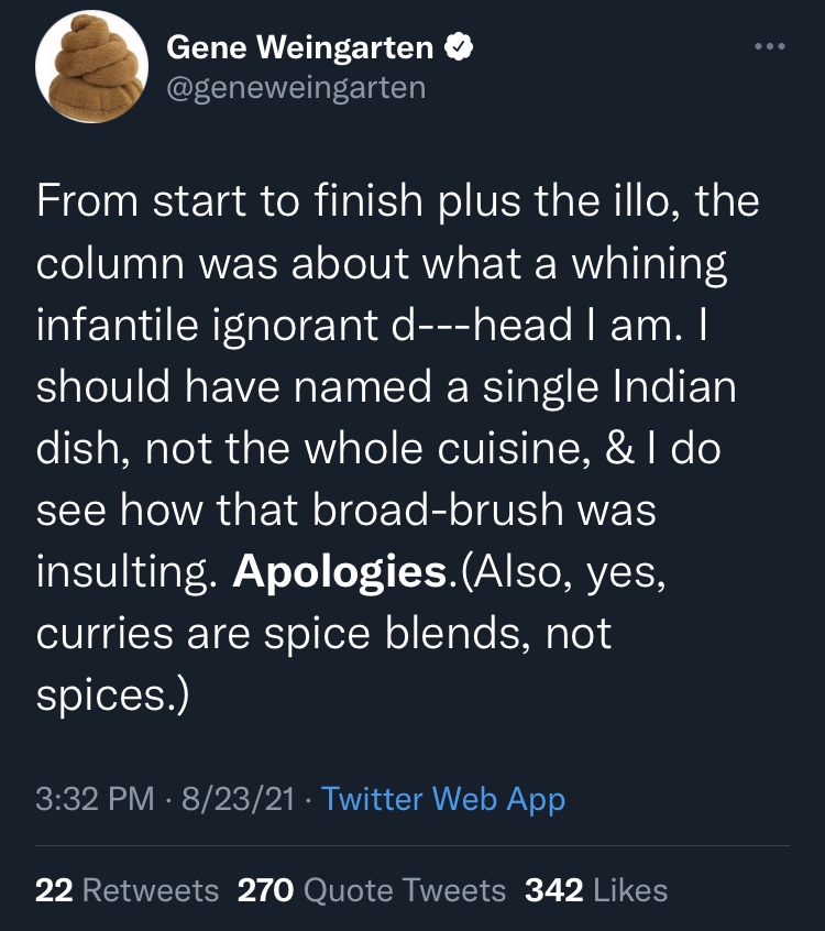 Later, Weingarten threw more gasoline onto the fire by implying that all Indian food is smothered in curry (which isn’t really a thing – the word is essentially derived from a word meaning gravy or sauce; for a good primer, check out this Atlantic Magazine article) and tosses in a weird “knocking a vulture off a meat wagon” reference to reflect his dislike of, in his mind, a one-spice and one-form cuisine.