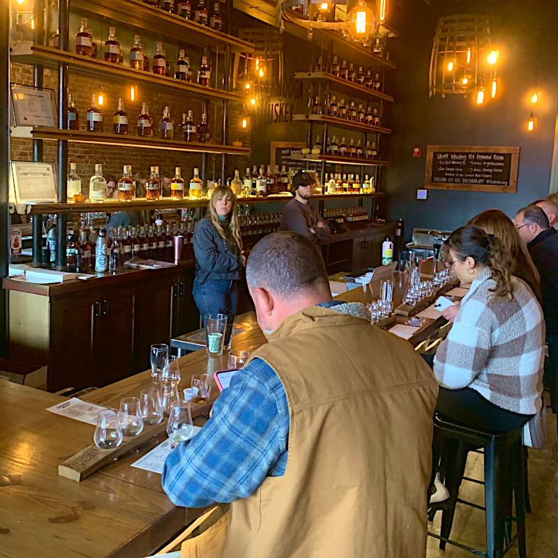 The tasting room is quite beautiful, with a sit down bar and several surrounding tables (an outdoor area is also available during the warmer weather months.) Touting itself as the state’s only High Malt Whiskey, we sampled their base 91 and 111 proof base spirits, as well as a rye, a couple of their experimental barrels as well as their take on an Old Fashioned cocktail.