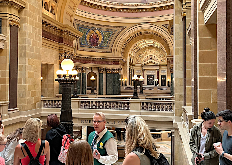 Other Notables: The Wisconsin State Capitol Building is the third such state government building we’ve toured. In some ways, each building is grandiose in its construction and the stated purpose (good old American Democracy – I’ve heard the phrase “remember, this is the Peoples’ house” on all these tours.) I think many people have soured on this idealized view of their government, but there’s no doubt that the buildings themselves haven’t lost any of their charm and historical value…If only all hotels could have a place like La Taguara within walking distance: their Catira and Llanera Venezuelan Arepas were perfect dine-inside your hotel room…Good old rich butterfat ice cream is a treat for most everyone (even for slightly lactose intolerant folks like me) so it’s not surprising that we have found Madison-based Chocolate Shoppe Ice Cream served in places from Bemidji, MN down to Columbus, OH. Always nice to have it at the source however and the downtown location has all the ice cream shop trappings you could want…The good news: Madison’s Henry Vilas Zoo is free, and it has quite a few areas available for the public to bring in a packed lunch. The bad news is that it’s a free admission zoo: funding is not guaranteed, and a few sections of the facility are a bit on the shopworn side, which is unfortunately the risk you run with such a setup. Parking surrounding the zoo is also not as plentiful as one might one (we showed up early during the week and had issues.) I’d say this zoo is mainly a locals’ affair, but if you’re in town looking for cheap entertainment for your kids, this zoo will do the trick, and we managed to score the best animal-related video (shown below) of the trip here…Unsurprising that a college town and capital city has its share of coffee establishments, and Wonderstate’s downtown location offers up ample glass windows and a view of the Statehouse along with its well-crafted coffee drinks and pastries…Meanwhile, Stone Creek Coffee (no pictures, unfortunately) is a regional small-sized coffee chain (closest equivalent here in Central Ohio I can think of is Dayton-based Boston Stoker) with cafes scattered from Milwaukee westward into the Oconomowoc (where we saw our last minor league baseball game) area. If you’re mermaid-phobic and nothing hyperlocal is available, you could do far worse than Stone Creek (and their Jinglesnap Ginger Molasses Cookie is great roadtrip snacking)…Finally, we didn’t get to any of it, but any Frank Lloyd Wright aficionados will definitely want to hit up his works in the Madison area and surroundings. Signs for The Frank Lloyd Wright Trail were visible all around during our stay in Wisconsin.